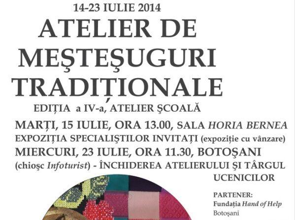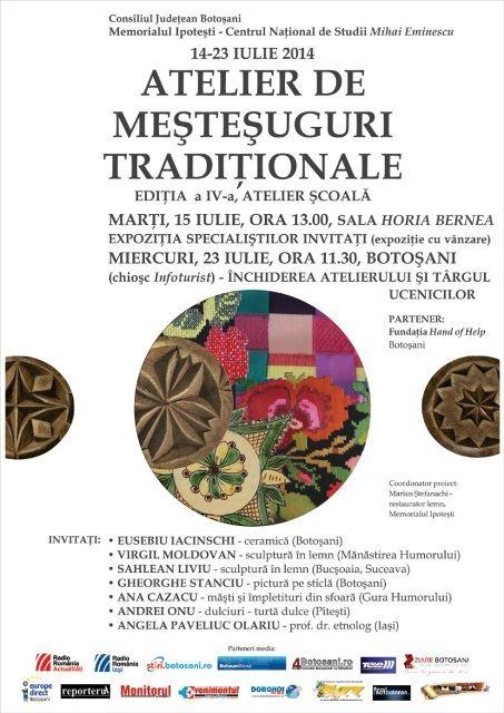 Memorialul Ipoteşti – Centrul Naţional de Studii Mihai Eminescu în parteneriat cu Fundaţia Hand of Help - Botoşani organizează în perioada 14-23 iulie 2014 ATELIERUL DE MEŞTEŞUGURI TRADIŢIONALE, ediţia a IV-a.