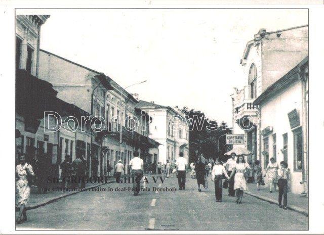 Fotografia pe care o prezentăm mai jos este executată cu câţiva ani înainte de a începe demolarea centrului oraşului. Pentru pasionaţii de istorie locală vom aminti câteva date mai semnificative legate de porţiunea de stradă Grigore Ghica din str. I.C. Brătianu (astăzi D. Pompeiu) până la primăria în reconstrucţie. A rămas în picioare, pe partea dreaptă spre deal, doar cocheta clădire a Stării Civile. În momentul construcţiei, înainte de anul 1920, a fost sediul Băncii Dorohoiului-proprietatea lui Adolf Witner, dar şi a avocatului Marcovici Mureş, iar în preajma anului 1940 a devenit locuinţa învăţătoarei Octavia Răutu. Pe partea stângă spre deal, au rămas în picioare clădirea fostului restaurant Central, clădirea Casei Sindicatului Învăţământ construită în 1936 pe un teren cumpărat de la Elisabeta Spinzi, apoi Grădina Mică amenajată de Ioan Calcântraur în 1880 şi clădirea impunătoare a fostei Bănci Naţionale a României-filiala Dorohoi, clădire donată primăriei de familia Vârnav şi în care a funcţionat Şcoala Primară nr.1 de băieţi „Gh. Asachi”, între anii 1855-1901.