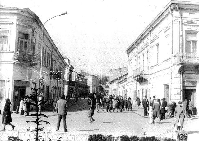 Urmărind fotografia veche, pe partea stângă spre deal: la colţ era o farmacie, ulterior devenită florărie, urma filiala CEC urmată de sediul Organizaţiei Sportul Popular condus pe atunci de Silberman. În continuare era o mică străduţă numită str. Templului. Se continua cu diferite magazine şi ateliere de reparaţii, era un atelier foto, o agenţie loto a unui mare fan al sportului dorohoian, Paul Leibovici. Urma strada Meseriaşilor care ducea în Piaţa Unirii (astăzi piaţa Wasserman), apoi hotelul Splendid şi Societatea Cooperativă „Deşteptarea” devenită apoi Federala. Se continua cu restaurantul Central, Casa Sindicatului Învăţământ, Grădina Mică, Banca Naţională până la str. Poştei.