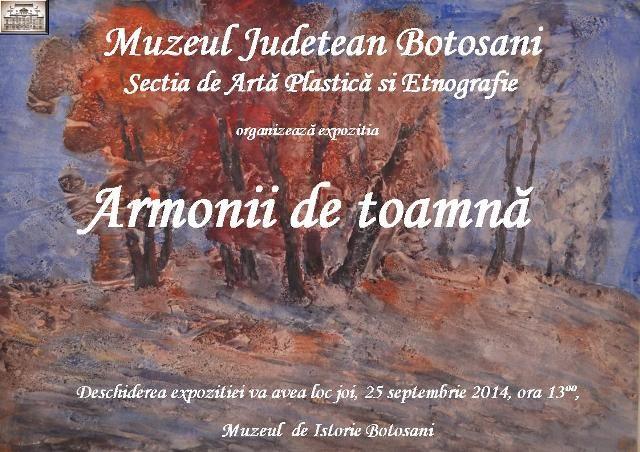 Muzeul Judetean Botosani organizeaza joi, 25 septembrie 2014, ora 13.00, deschiderea expozitiei„ Armonii de toamnă”.