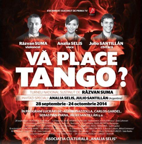 TANGO-ul, genul muzical - dedicat dansului - cu cea mai spectaculoasă poveste, doi invitaţi speciali originari chiar din ţara tango-ului şi a compozitorilor săi – Argentina, un repertoriu semnat de cei mai mari compozi¬tori de gen, 13 concerte în 12 oraşe din România, acestea sunt elementele care compun turneul naţional „VĂ PLACE TANGO ?”, prezentat de violoncelistul RĂZVAN SUMA, între 28 septembrie - 24 octombrie 2014.