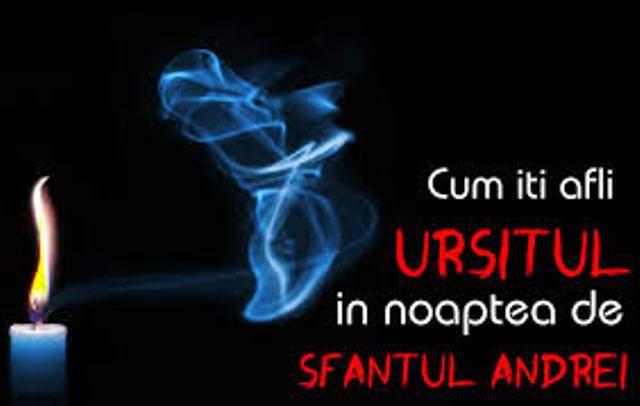 În noaptea premergătoare sărbătorii Sfîntului Andrei (29/30 noiembrie), în special la sate, se practică încă ritualuri ciudate, din credinţa că astfel se pot găsi mai uşor protecţia de toate relele, bunăstarea şi chiar dragostea. Vrăji de dragoste Cele mai multe ritualuri sînt dedicate atragerii iubirii. De pildă, prin ascunderea sub pernă a unui fir de busuioc sfinţit, se crede că se obţine în vis imaginea "ursitului". Pentru "atragerea" acestuia este mult folosită şi metoda "făcutului cu ulcica". La miezul nopţii, singură la gura sobei, tînăra întoarce cu gura în jos o ulcică nouă de lut, iar pe dosul vasului lasă sa pîlpîie trei cărbuni. În timp ce roteşte ulcica uşor, rosteşte o incantaţie menită a suscita o atracţie irezistibilă pentru cel iubit. O altă metodă folosită pentru cunoaşterea viitorului constă în a privi, la miezul nopţii, între două lumînări aprinse, într-un pahar cu apă neîncepută, aşezat pe cenuşă. În centrul paharului este lăsată să cadă o verighetă care a fost deja sfinţită de preot prin cununie religioasă şi se crede că în verighetă apare chipul ursitului, dacă este privită intens cîteva minute.