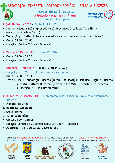 În orașul Bucecea, Asociația „Tineretul Ortodox Român” – Filiala Bucecea (A.T.O.R. Bucecea), în parteneriat cu Biroul Pro Vita – Protopopiatul Dorohoi, va desfășura următorul program:
