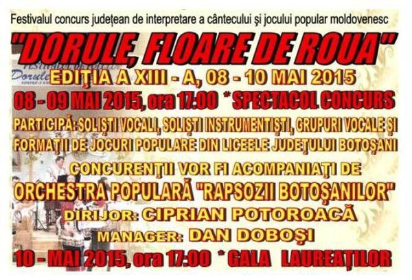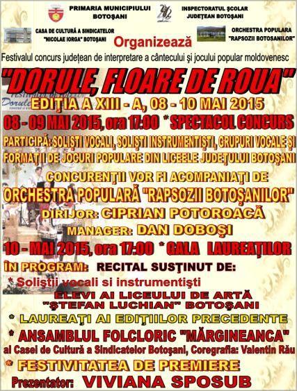 Casa de Cultură a Sindicatelor „Nicolae Iorga” Botoşani în colaborare cu Inspectoratul Şcolar al Judeţului Botoşani si Orchestra Populara "Rapsozii Botosanilor", organizează în perioada 08 - 10 mai 2015, cea de a XIII - a ediţie a Festivalului-concurs judeţean de interpretare a cantecului si dansului popular moldovenesc „DORULE, FLOARE DE ROUĂ”