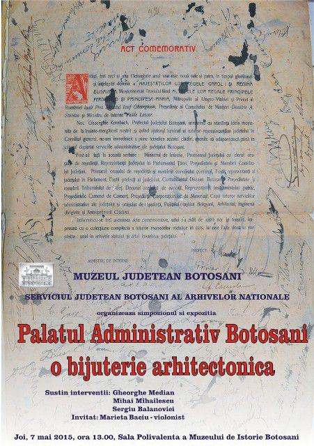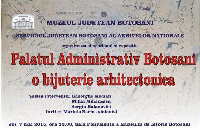Muzeul Judeţean Botoşani organizează joi, 7 mai 2015, ora 13.00, în Sala Polivalentă a Muzeului de Istorie Botoşani, simpozionul şi expoziţia „Palatul Administrativ Botoşani – o bijuterie arhitectonică”.