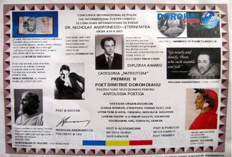 Dimitrie Dorohoianu a obținut premiul al II –lea la un concurs internaţional de poezie patriotică desfăşurat la Stamford, Conneticut, USA.