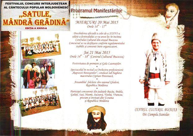 Centrul Judeţean pentru Conservarea şi Promovarea Culturii Tradiţionale Botoşani, sub patronajul Consiliului Judeţean Botoşani, Primăria şi Consiliul Local Bucecea, Centrul Cultural Bucecea, organizează Festivalul-concurs interjudeţean de interpretare a cântecului popular moldovenesc „SATULE, MÂNDRĂ GRĂDINĂ”, ediţia a XXXVI-a. Festivalul se va desfăşura în incinta Centrului Cultural din oraşul Bucecea în perioada 20 – 21 mai 2015.
