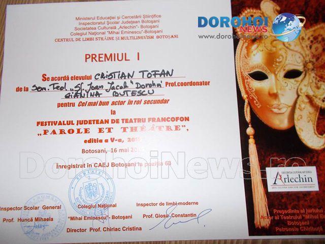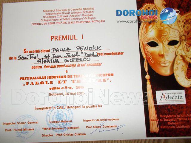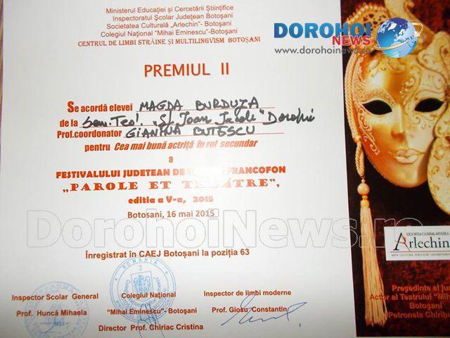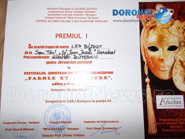 Trupa „Les bijoux”, a Seminarului Teologic Liceal „Sf. Ioan Iacob” Dorohoi, sub coordonarea doamnei profesoare de limba franceză, Gianina Butescu, a participat în concurs cu piesa de teatru, „L’affaire Laferre”. Componența trupei a fost următoarea: Larisa Purice, Diana Stan, Laura Grierosu, Diana Ioniță, din clasa a IX-a bilingv, Tofan Cristian și Lucian Prodan, din clasa a IX-a pastorală , Magda Burduja, Paula Penciuc și Bacrău Codruța, clasa a X-a bilingv, Roxana Hanganu, Elena Avădăni și Roxana Ibănișteanu din clasa a XI-a bilingv.