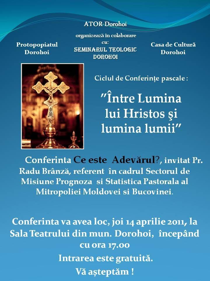 ATOR Dorohoi in colaborare cu Protopopiatul Dorohoi, Seminarul Teologic Dorohoi si Casa de Cultura a Municipiului Dorohoi va invita joi, 14 aprilie 2011, incepand cu ora 17:00 la Sala de Spectacole a Municipiului Dorohoi la Conferinta - Ce este adevarul ?, Conferinta ce face parte din ciclul de Conferinte pascale - ”Între Lumina lui Hristos şi lumina lumii”.