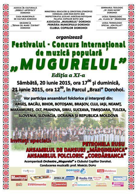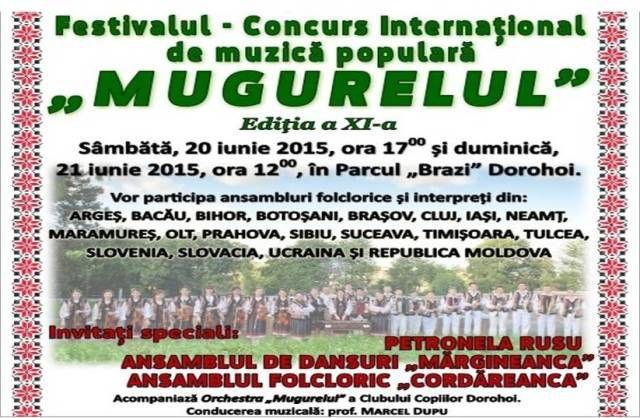 Sâmbătă, 20 iunie 2015, ora 17.00 şi duminică, 21 iunie 2015, începând cu ora 12.00 (parada portului popular pe traseul Parcul „Cholet” – blocul turn – pietonal – Str. A. I. Cuza – Parcul „Brazi”), se va desfăşura, în Parcul „Brazi” Dorohoi, cea de-a XI-a ediţie a Festivalului Internaţional de muzică populară „Mugurelul” Dorohoi.