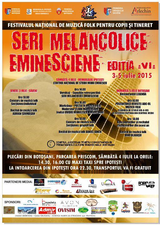 Asociaţia Judeţeană a Organizatorilor de Evenimente Botoşani, Memorialul Ipoteşti, Primăria şi Consiliul Local al Municipiului Botoşani vă invită sâmbătă, 4 iulie 2015 să participaţi la a doua zi a Festivalului Naţional de muzică folk pentru copii şi tineret "Seri melancolice eminesciene" aflat anul acesta la ediţia a VI-a. Evenimentul se va desfăşura în intervalul orar 18.00 – 22.00 la Memorialul Ipoteşti unde vor participa la etapa naţională a concursului de muzică folk secţiunea grupuri următoarele formaţii: