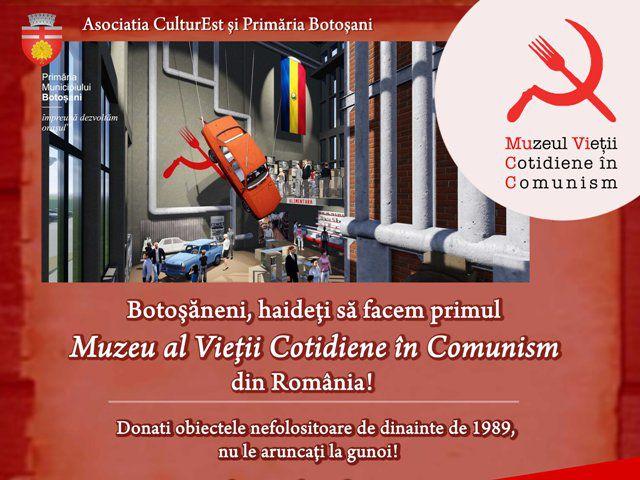 Pe 15 iulie a.c., la Botoșani și București, au început două proiecte importante ale Muzeului vieții cotidiene în comunism (MuViCC), unul care urmărește urgentarea colectării de obiecte muzeale, activitate finanțată din fonduri nerambursabile de la Primăria Botoșani și altul prin care vor fi proiectate câteva expoziții tematice permanente, cu baze de date istorice aferente, lucrări finanțate din fonduri nerambursabile de la Consiliul județean Botoșani.