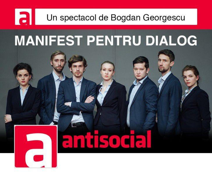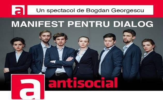 Subiectul piesei Antisocial vă este, probabil, familiar. Într-un liceu din România anului 2015, elevii creează un grup secret pe o platformă de socializare. Profesorii află, se infiltrează și îi demască. Cu ajutorul unor elevi. Bogdan Georgescu, autorul spectacolului, a folosit acest punct de plecare pentru a construi o poveste complexă și provocatoare, care îmbină biografiile reale ale actorilor cu teme actuale. Pentru a duce mai departe întrebările ridicate de spectacol, acesta este urmat de o dezbatere liberă cu publicul.