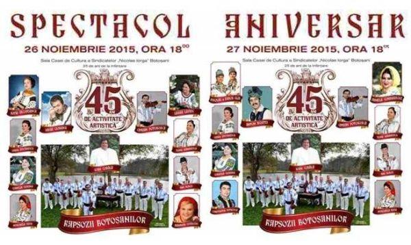 In ziua de 27 noiembrie vor evolua artistii: Nicolae si Isidor Glib, Daniela Condurache, Anton Achitei alaturi de solistii orchestrei „Rapsozii Botosanilor’’.