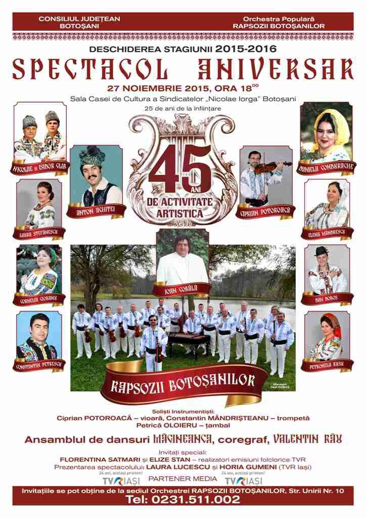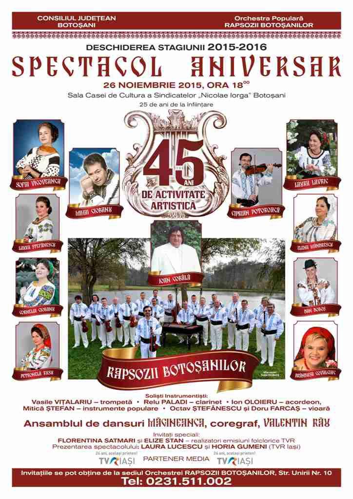 Orchestra Populara „Rapsozii Botosanilor’’ invita spectatorii la deschiderea stagiunii 2015-2016 in data de 26 si 27 noiembrie 2015, incepand cu orele 18:00 la Casa de Cultura a Sindicatelor Botosani.