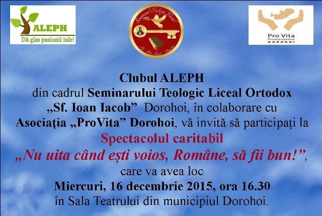 Clubul ALEPH din cadrul Seminarului Teologic Liceal Ortodox „Sf. Ioan Iacob” Dorohoi, în colaborare cu Asociația „ProVita” Dorohoi, vă invită să participați la Spectacolul caritabil „Nu uita când ești voios, Române, să fii bun!”, care va avea loc Miercuri, 16 decembrie 2015, ora 16.30 în Sala Teatrului din municipiul Dorohoi.