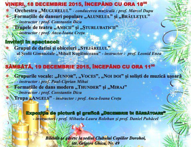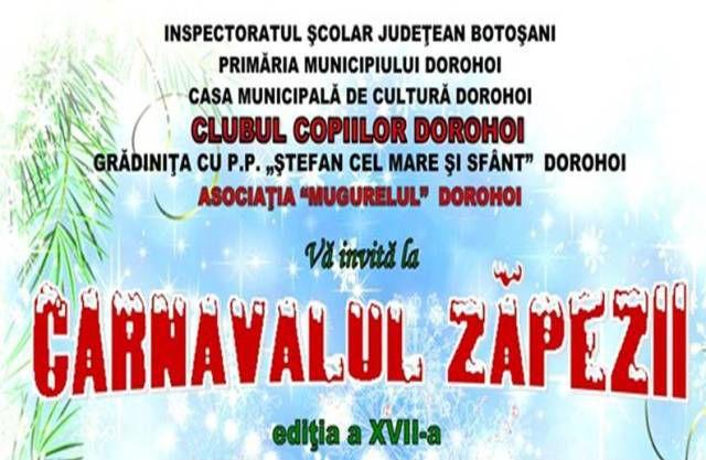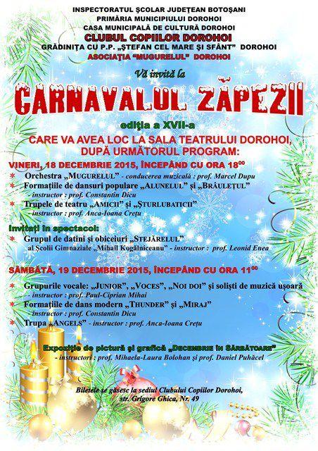 Concertul tradiţional de sărbători „Carnavalul Zăpezii”al Clubului Copiilor Dorohoi va avea loc anul acesta în zilele de 18 și 19 decembrie, la Sala Teatrului din Dorohoi. Ediția a XVII-a se va desfășura după următorul program: