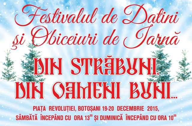 Centrul Județean pentru Conservarea și Promovarea Culturii Tradiționale Botoșani, instituție de cultură aflată sub patronajul Consiliului Județean Botoșani, organizează Festivalul de datini și obiceiuri de iarnă „Din străbuni, din oameni buni…”, ediția a 41- a, sâmbătă și duminică, 19 - 20 decembrie 2015, în Piața Revoluției din Municipiul Botoșani.