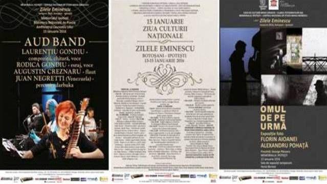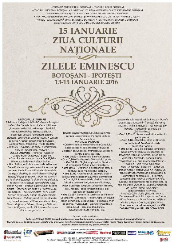 Primăria Muncipiului Botoşani Consiliul Local Botoşani Fundaţia Culturală Hyperion-Caiete Botoşănene Botoşani în Colaborare cu Consiliul Judeţean Botoşani Memorialul Ipoteşti – Centrul Naţional de studii Mihai Eminescu Cu Sprijinul Centrului Judeţean Pentru Conservarea Şi Promovarea Culturii Tradiţionale Botoşani Bibliotecii Judeţene Mihai Eminescu Botoşani Teatrului Mihai Eminescu Botoşani Societăţii Culturale Raluca Iuraşcu Vorona organizează în zilele de 13 – 15 ianuarie 2016 ZILELE EMINESCU ediţia a XLVII-a şi Premiul Naţional de Poezie Mihai Eminescu ediţia a XXV-a.