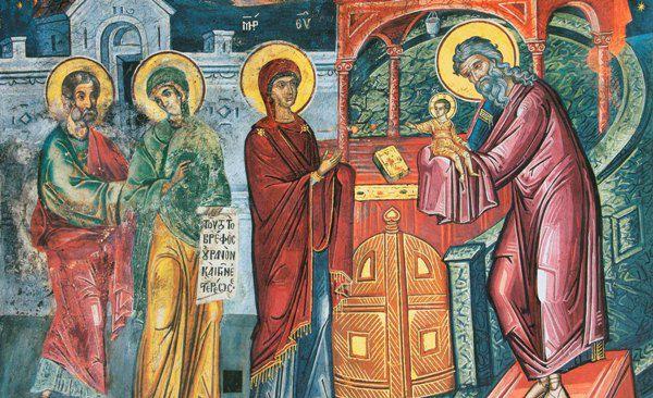 Întâmpinarea Domnului este prăznuită la 40 de zile de la naşterea lui Hristos, pe 2 februarie. Mântuitorul este dus la Templu de Fecioara Maria şi dreptul Iosif pentru împlinirea Legii, care prevedea că orice întâi născut de parte bărbătească să fie afierosit lui Dumnezeu în a 40 a zi de la naştere. În acest moment se făcea şi curăţirea mamei. În Templu sunt întâmpinaţi de dreptul Simeon şi prorocita Ana. Potrivit Tradiţiei, dreptul Simeon a făcut parte din traducătorii Pentateuhului din limba ebraică în greacă. În momentul în care a ajuns la textul „Iată Fecioara va lua în pântece şi va naşte fiu“, a înlocuit termenul "fecioara” cu "femeie”. Pentru necredinţa sa, Dumnezeu i-a făgăduit că nu o să moară până nu va vedea pe Mesia născut din Fecioara (Luca 2, 25-26).