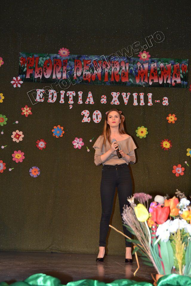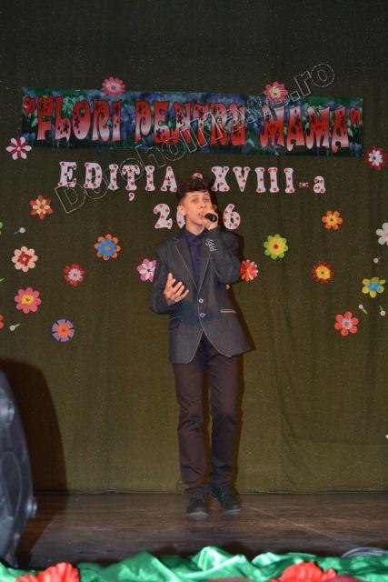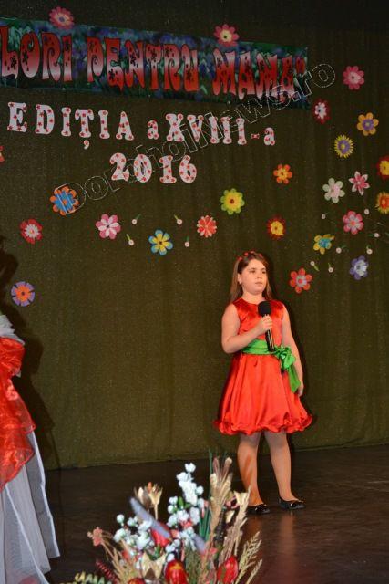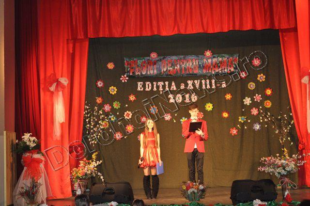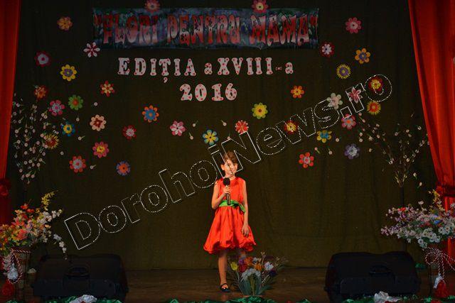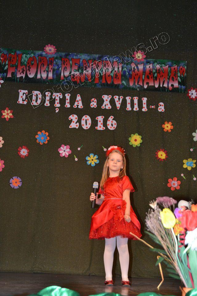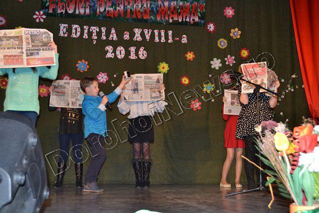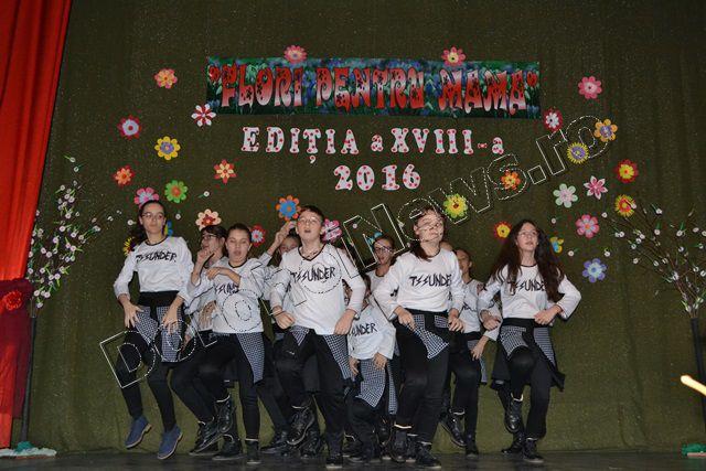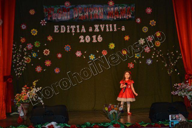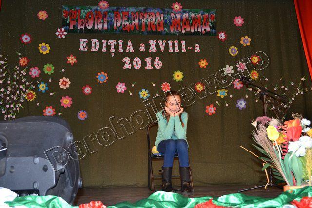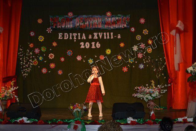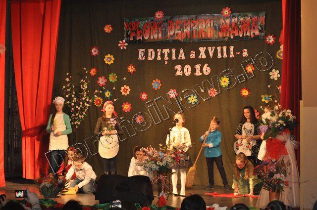 Muzica ușoară, dansul modern și teatrul au înnobilat prima parte a spectacolului „Flori pentru mama”, ediţia a XVIII-a, care a avut loc vineri, 11 martie 2016, începând cu ora 17:30. Evenimentul cultural este organizat de Clubul Copiilor Dorohoi sub egida Inspectoratului Şcolar Judeţean Botoşani şi a Primăriei municipiului Dorohoi, în parteneriat cu Grădiniţa „Ştefan cel Mare şi Sfânt” Dorohoi, Asociaţia „Mugurelul” Dorohoi şi Casa Municipală de Cultură Dorohoi.