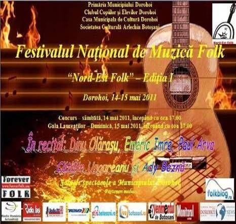 Emoţiile concurenţilor de la Festivalul Național de Muzică Folk „Nord-Est Folk” vor lua în curând sfârşit. Organizat cu scopul de a descoperi noi talente interpretative şi de creaţie a muzicii folk, festivalul urmează să se desfăşoare în perioada 14-15 mai, începând cu ora 17.00 la Sala Teatrului din Dorohoi.