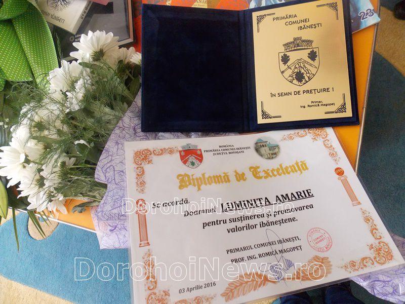 După ce elevii școlii au adus în atenția celor prezenți o serie de poezii din volumele Luminiței, în semn de recunoștință și prețuire, primarul comunei Ibănești, dl. ing. Romică Magopeț a oferit Luminiței Amarie flori, o diplomă și o plachetă. De asemenea, asistentul social din cadrul Serviciului de Asistență Socială Ibănești, dl Aboghioaie Petru a fost răsplătit și el pentru premiul „Asistentul social din domeniul asistenței sociale comunitare” obținut la Gala Națională a Excelenței în Asistență Socială desfășurat în luna martie la București.