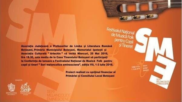Asociația Județeană a Profesorilor de Limba și Literatura Română Botoșani, Primăria Municipiului Botoșani, Memorialul Ipotești și Asociația Culturală ”Arlechin” Botoșani vă invită Miercuri, 25 Mai 2016, ora 18.30, sala media de la Casa Tineretului Botoșani să participați la Conferința de lansare a Festivalului Național de Muzică Folk pentru copii și tineri - Seri melancolice eminesciene 2016.
