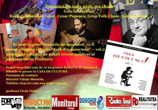 Sâmbătă, 18 iunie 2016, va avea loc un Spectacol-concurs cu premii importante, vizând tinere talente din muzica folk, care să participe cu 2 compoziții proprii. In aceeasi seara va urma un Recital susținut de Stefania Iacob, Nicu Zotta și Cristi Corcioveanu