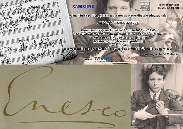 Vizitatorii sunt astfel invitați să descopere operele lui George Enescu și informații despre viața acestuia prin intermediul aplicației „Acasă la Enescu”. Mai mult, aceștia își pot testa cunoștințele muzicale prin intermediul tehnologiei și pot recrea operele acestuia pe portativul aplicației. În cadrul proiectului, Muzeul Memorial „George Enescu” va fi dotat cu 6 tablete și un eBoard Samsung care vor schimba modul de interacțiune a vizitatorilor cu exponatele și vor aduce un nou mod de vizitare. Proiectul face parte din inițiativele CSR ale companiei și continuă eforturile de digitalizare și promovare a valorilor românești demarate prin parteneriatul cu Muzeul Județean Botoșani.