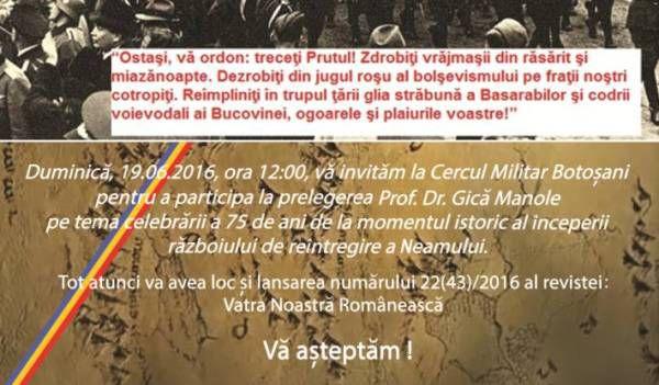 Duminică, 19.06.2016, ora 12:00, vă invităm la Cercul Militar Botoşani pentru a participa la prelegerea Prof. Dr. Gică Manole pe tema celebrării a 75 de ani de la momentul istoric al începerii războiului de reîntregire a Neamului.