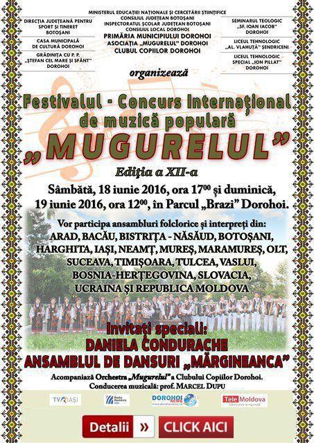 Cea de-a XII-a ediţie a Festivalului Internaţional de muzică populară „Mugurelul” Dorohoi va debuta astăzi, 18 iunie 2016 începând cu ora ora 17:00 şi mâine, 19 iunie 2016, începând cu ora 12.00 (parada portului popular pe traseul Parcul „Cholet” – blocul turn – pietonal – Str. A. I. Cuza – Parcul „Brazi”). Evenimentul se va desfășura în Parcul „Brazi” Dorohoi.