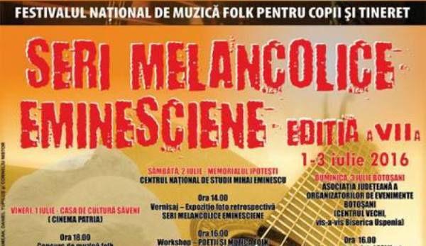 În acest week-end, 1-3 iulie 2016, botoșănenii sunt invitați să participe la Festivalul Naţional de muzică folk pentru copii şi tineret „Seri melancolice eminesciene”.