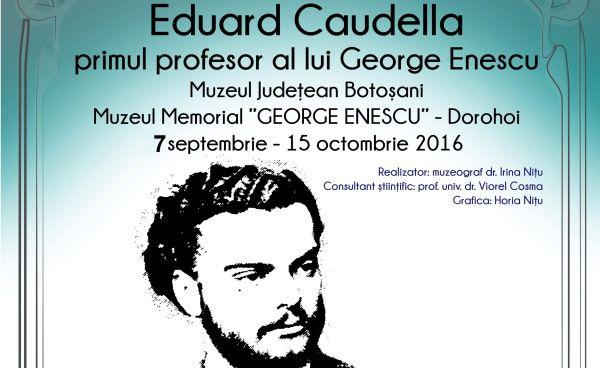Muzeul Județean Botoșani organizează miercuri, 7 septembrie 2016, ora 14.00, în Sala Polivalentă a Muzeului Memorial „George Enescu” Dorohoi, vernisajul expoziţiei „Eduard Caudella – primul profesor al lui George Enescu”. Prezintă: muzeograf Lidia Alexie.
