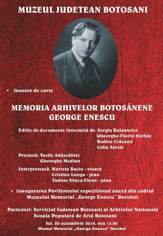 Muzeul Judeţean Botoşani organizează joi, 20 octombrie 2016, ora 13.00, în Sala Polivalentă a Muzeului Memorial „George Enescu” Dorohoi, lansarea volumului Memoria arhivelor botoşănene - George Enescu, ediţie de documente întocmită de Sergiu Balanovici, Gheorghe-Florin Ştirbăţ,