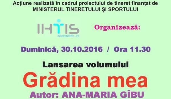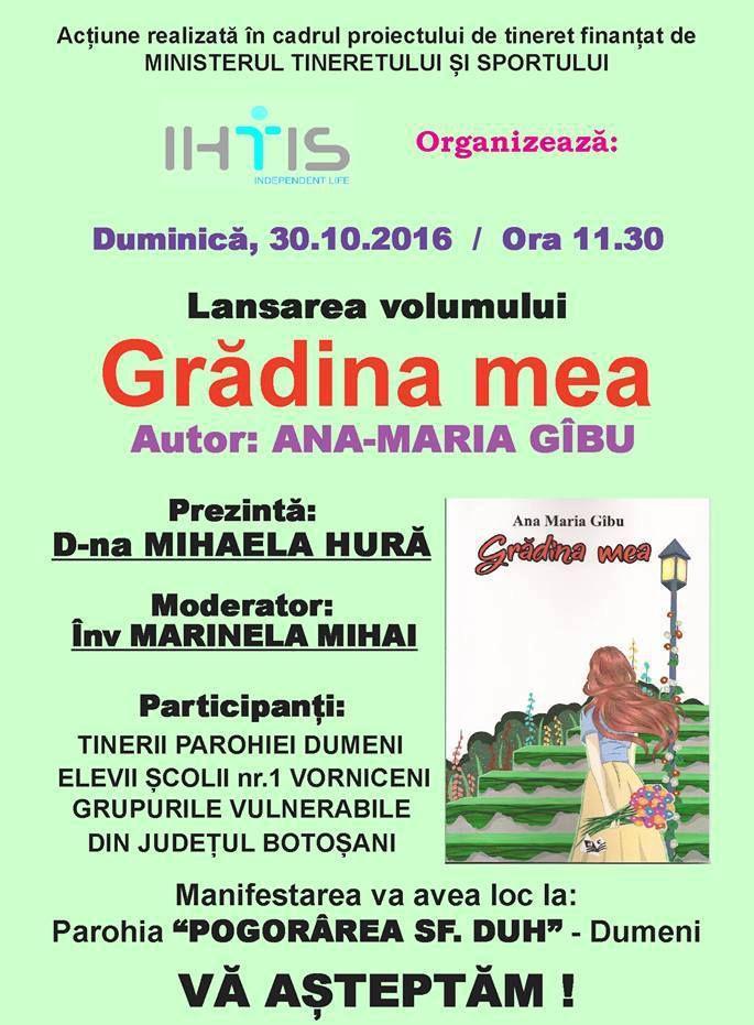 Lansarea volumului de versuri „Grădina mea” va avea loc şi la Botoșani. în cadrul Festivalului – concurs „Trec magii prin vatra Moldovei”, din 12 noiembrie, precum și – la cerere - în centre de plasament și școli speciale din Județul Botoșani. (Mihaela Mihăescu).