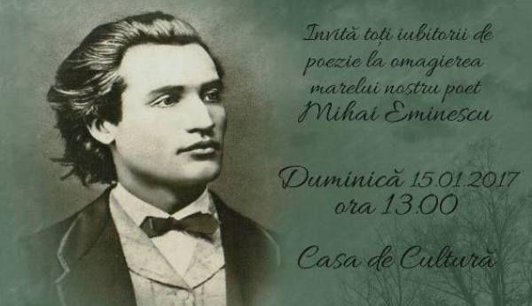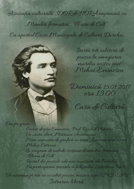 Asociaţia culturală DOR de HORA va așteaptă la Casa Municipală de Cultură Dorohoi să-l sărbătorim împreună pe Poetul „inimilor noastre” Mihai Eminescu, duminică, 15 ianuarie 2017, la orele 13:00. Intrarea liberă