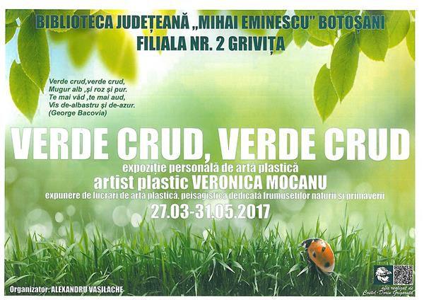 „Verde crud, verde crud” este titlul expoziţiei găzduite între 27 martie şi 31 mai 2017 de Filiala nr. 2 Griviţa. Lucrările prezentate au ca temă peisagistica dedicată frumuseţilor naturii şi primăverii. Tot ano-timpul renaşterii este surprins de Veronica Mocanu şi în expoziţia „Mireasma Primăverii”, de la Filiala nr. 1 Primăverii a Bibliotecii Judeţene Botoşani (1 aprilie – 30 mai 2017).