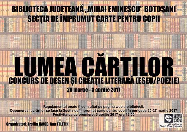 Secția de împrumut carte pentru copii a Bibliotecii Județene „Mihai Eminescu” Botoșani a organizat în perioada 20 martie – 3 aprilie 2017 concursul „Lumea cărţilor prin desen şi creaţie literară ”, cu prilejul aniversării Zilei Internaţionale a Cărţii pentru Copii şi Tineret. Concursul s-a derulat pe două secţiuni: Secţiunea Desen pentru elevii claselor I-X şi Secţiunea Creaţie literară (eseu/poezie) pentru elevii claselor V-X.