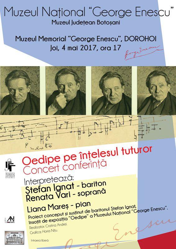 Muzeul Naţional „George Enescu” Bucureşti şi Muzeul Judeţean Botoşani organizează joi, 4 mai 2017, ora 17.00, în Sala Polivalentă a Muzeului Memorial „George Enescu” Dorohoi concertul-conferinţă