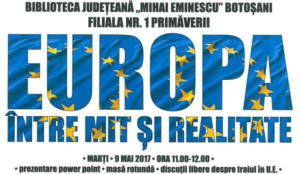 „Europa între mit şi realitate” este titlul activităţii propuse cu ocazia zilei de 9 mai, Ziua Europei, de Filiala nr. 1 a Bibliotecii Judeţene „Mihai Eminescu” Botoşani.