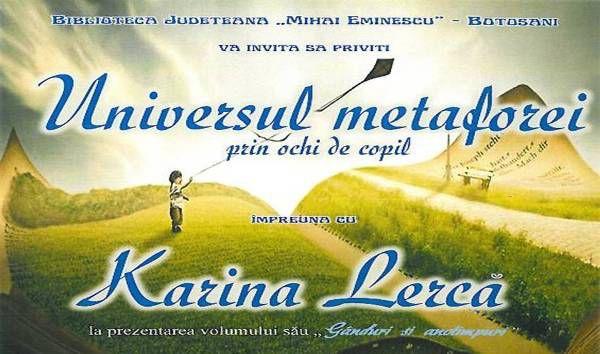 Miercuri, 14 iunie, începând cu orele 13:30, Secția de Limbi Străine a bibliotecii organizează manifestarea - spectacol „Universul metaforei prin ochi de copil” ce o are în prim plan pe Karina Lercă. La numai 12 ani, micuța scriitoare a uimit publicul iubitor de literatură, lansând primul său volum de versuri, intitulat „Gânduri și anotimpuri”, apărut la Editura Ștef, în 2017.