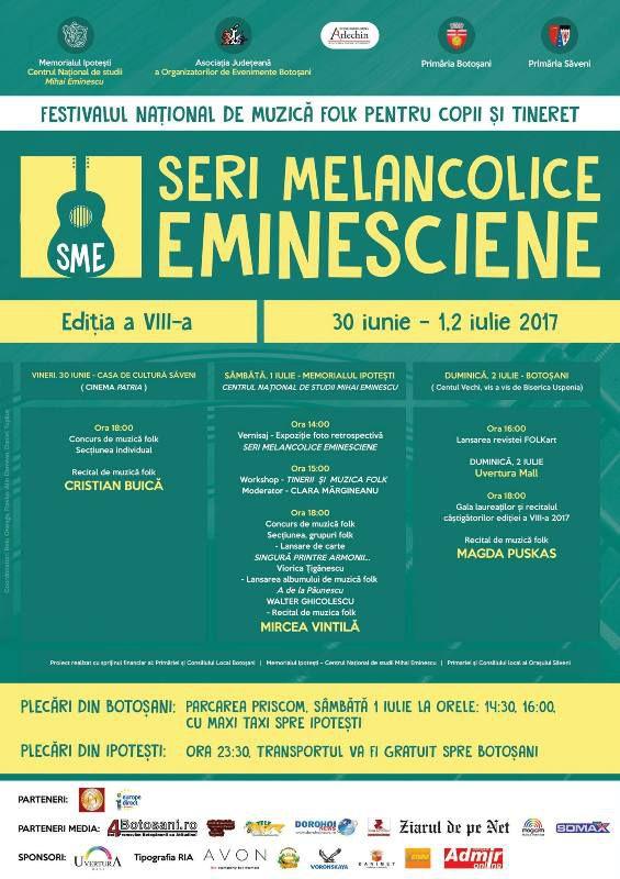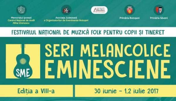 Cea de-a VIII-a ediţie a Festivalului Naţional de Muzică Folk Seri Melancolice Eminesciene începe la sfârşitul acestei săptămâni. Ca şi la ediţiile precedente, festivalul se va desfăşura pe parcursul a trei zile în trei locuri diferite: Săveni, Memorialul Ipoteşti şi Botoşani. În fiecare zi evenimentul începe la ora 18:00.