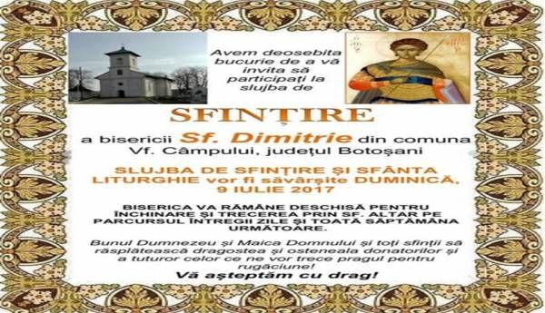Duminică, 9 iulie 2017, începând cu ora 8.00, se va oficia slujba de resfintire a Bisericii "Sfântul Mare Mucenic Dimitrie" - Vârfu Câmpului, cu binecuvântarea Înaltpreasfinţitului Părinte Teofan, Mitropolitul Moldovei şi Bucovinei, de către Preasfinţitul Părinte Calinic Botoşăneanul, episcop - vicar al Arhiepiscopiei Iaşilor, înconjurat de un sobor de preoţi şi diaconi.