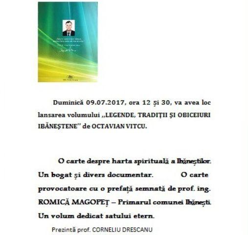 La Casa municipală de cultură Dorohoi, va avea loc duminică, 9 iulie 2017, la ora 12:30, lansarea cărţii „Legende, tradiţii şi obiceiuri ibăneştene”, volum semnat de profesorul Octavian Vitcu.
