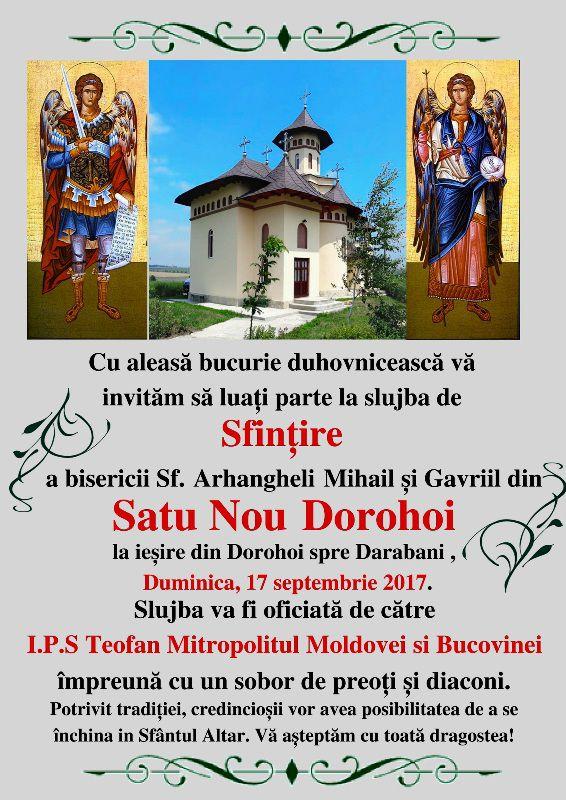 Avem deosebita bucurie de a vă invita să participați la Sfințirea Bisericii „Sfinții Arhangheli Mihail și Gavriil” din parohia Satu Nou Dorohoi situată la ieșirea din Dorohoi spre Darabani ce va fi oficiată de Înaltpreasfințitul Teofan, Arhiepiscop al Iașilor și Mitropolit al Moldovei și Bucovinei, împreună cu un sobor de preoți și diaconi, Duminică, 17 Septembrie 2017, începând cu orele 7:45.