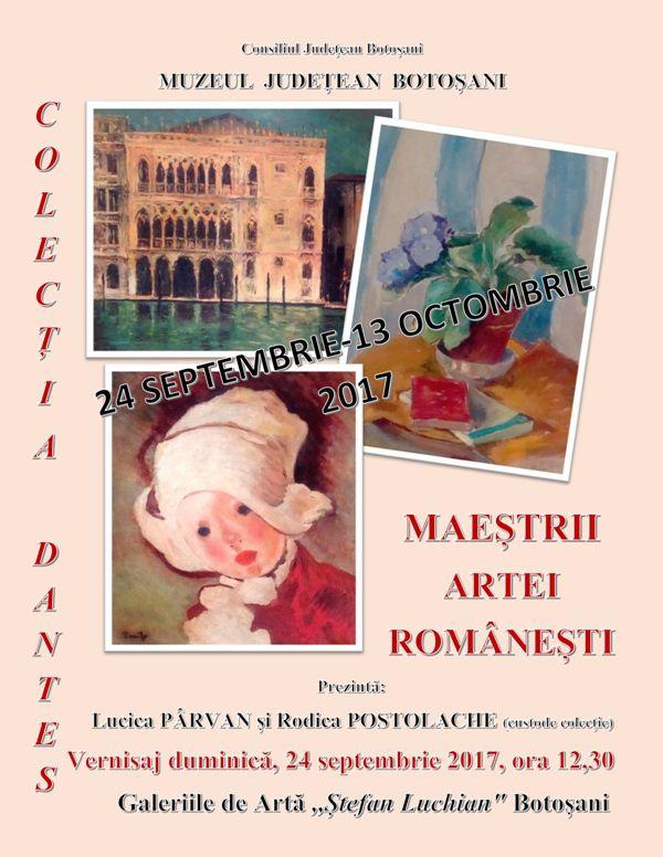 Muzeul Judeţean Botoşani vă invită, în perioada 24 septembrie – 13 octombrie 2017, în spaţiul Galeriilor de Artă „Ştefan Luchian” Botoşani, pentru a viziona expoziția „Maeștrii artei românești – Colecția Dantes (III)”.