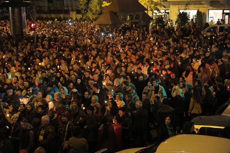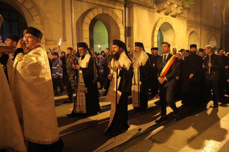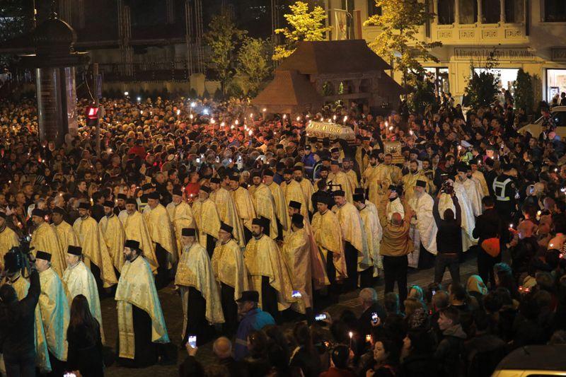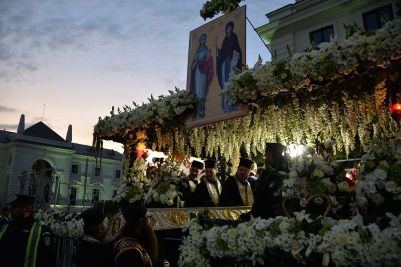 În această seară, la ora 19.00 a început procesiunea cumoaştele Sfintei Cuvioase Parascheva, împreună cu moaştele Sfântului Sfintei Întâi Mucenițe și Întocmai cu Apostolii Tecla. Cele două racle cu sfintele moaște au fost purtate pe străzile din centrul municipiului Iași. La acest moment au participat şi trei ierarhi – Înaltpreasfinţitul Părinte Teofan, Mitropolitul Moldovei şi Bucovinei, Preasfințitul Părinte Qais Sadiq, Episcop de Erzurum şi Vicar al Patriarhiei Antiohieiși Preasfinţitul Părinte Damaschin Dorneanul, Episcop-vicar al Arhiepiscopiei Sucevei și Rădăuților, alături de numeroși preoţidin Arhiepiscopia Iaşilor şi de credincioși din mai multe judeţe ale ţării. Procesiunea a fost deschisă de un grup de tineri în port popular, ţinând în mâini drapelul naţional şi o icoană, urmaţi de militari cu torţe aprinse.