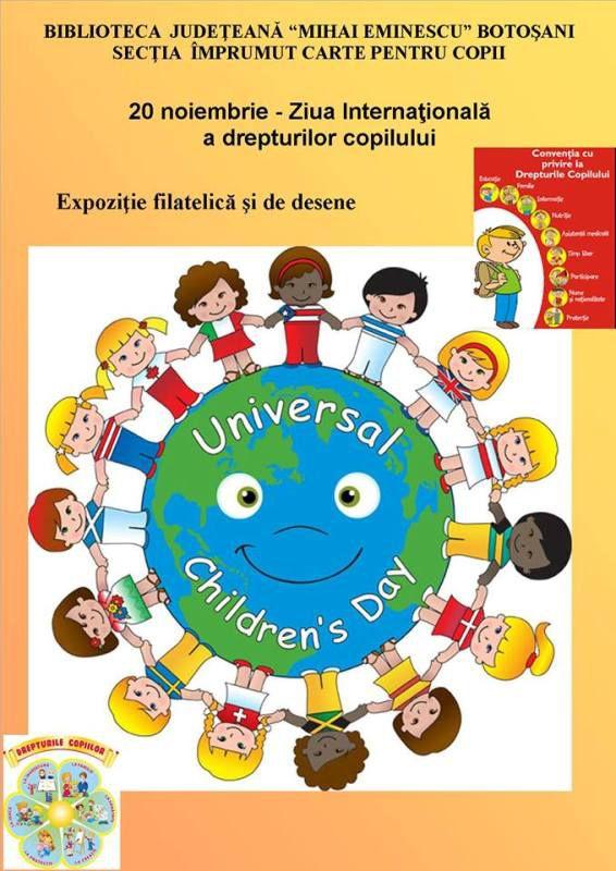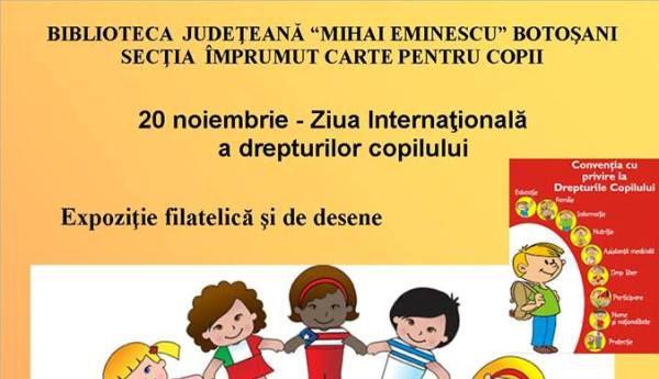 Pentru a marca acest moment deosebit, în perioada 20 – 25 noiembrie 2017, Biblioteca Judeţeană „Mihai Eminescu” Botoşani găzduieşte la Secţia Împrumut Carte pentru Copii o expoziţie filatelică şi una de desene care reflectă această tematică.