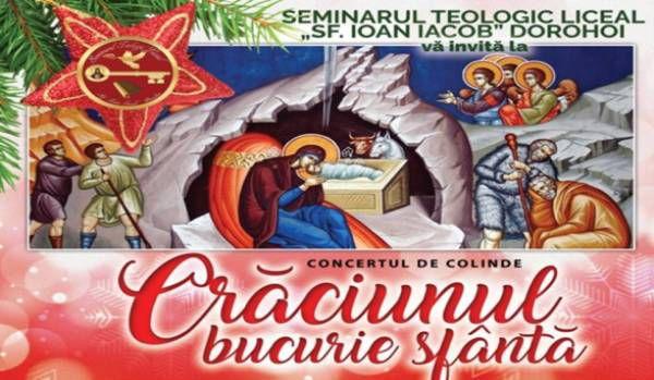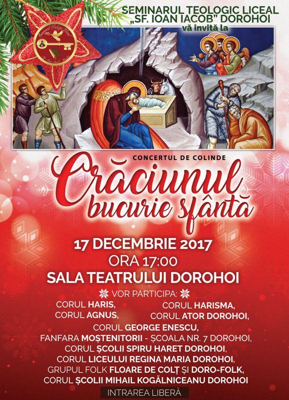 Seminarul Teologic „Sf. Ioan Iacob” Dorohoi vă invită la Concertul de Colinde „Crăciunul, bucurie sfântă", care va avea loc duminică, 17 decembrie 2017, începând cu ora 17.00, la Sala Teatrului din Dorohoi.